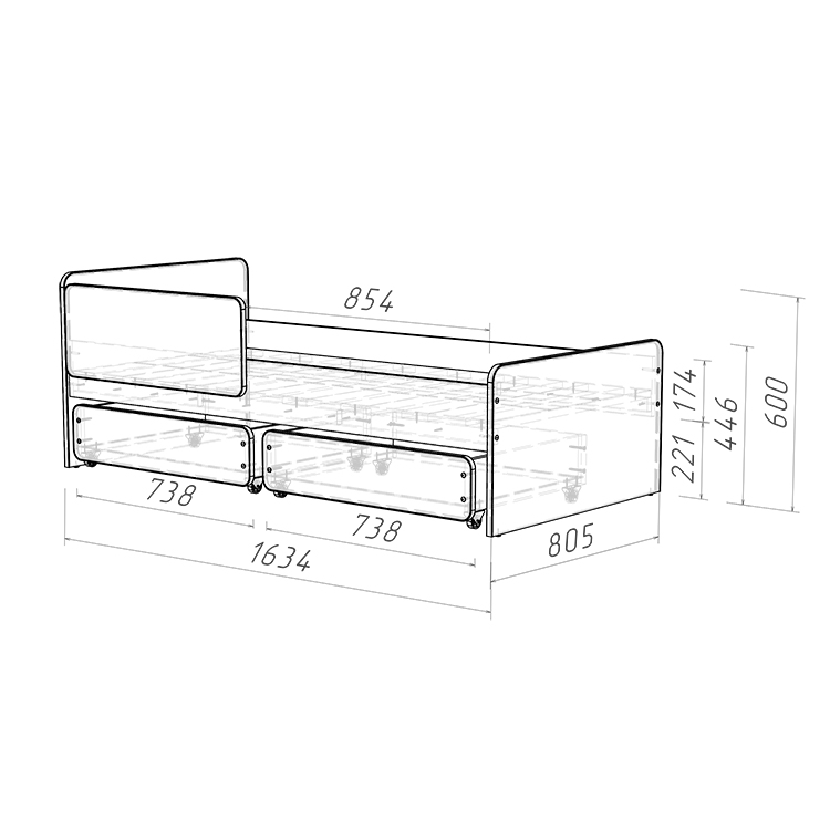 2. Выкатные ящики: Кровать оснащена двумя выкатными вместительными ящиками, которые легко выдвигаются благодаря прямоходным колесам. Это удобное решение для хранения игрушек, одежды или постельного белья, помогая поддерживать порядок в детской комнате.