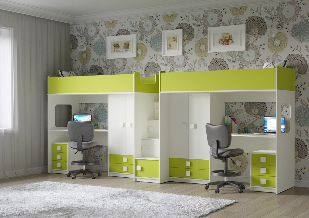 Под спальным местом для каждого ребенка располагается рабочее место с встроенным столом и вместительная тумба Л-04.