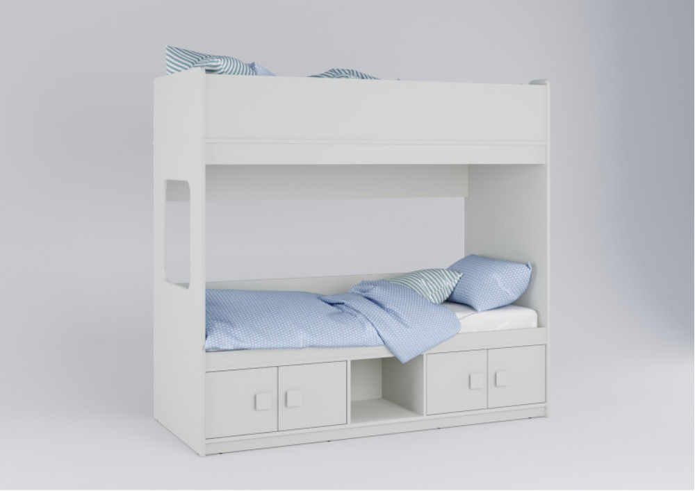 Классическая детская двухъярусная кровать с двумя параллельными спальными местами размером 1750х750 и 1900х750 и закрытыми местами хранения.